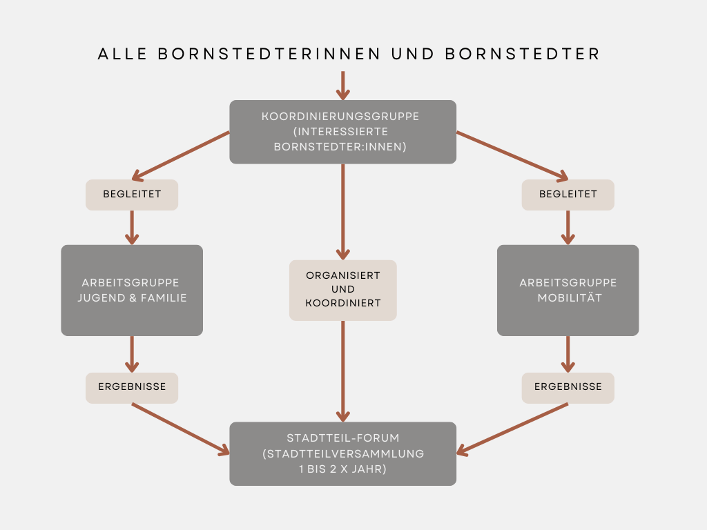 2024 haben sich Bornstedter:innen zusammengefunden und eine Struktur für eine Stadtteilvertretung für Bornstedt entwickelt. Diese Struktur ermöglicht, dass Themen aus Bornstedt gesammelt und besprochen werden können. Die Struktur wird jetzt ausprobiert und weiterentwickelt. Am 29.04.2025 fand das Stadtteil-Forum zum dritten Mal statt. Hier wurde sich über Entwicklungen im Stadtteil intensiv ausgetauscht und die Arbeitsform der Arbeitsgruppen bestätigt. Außerdem wurden neue Themen für die gemeinsame Bearbeitung gesammelt.